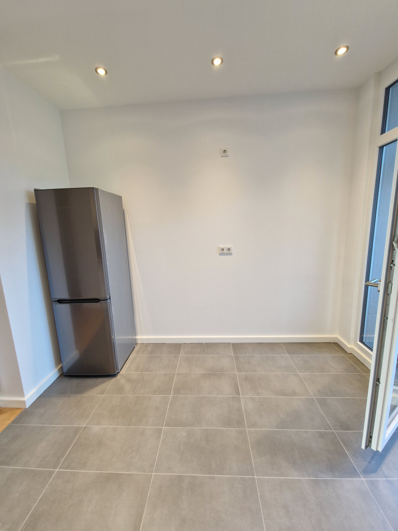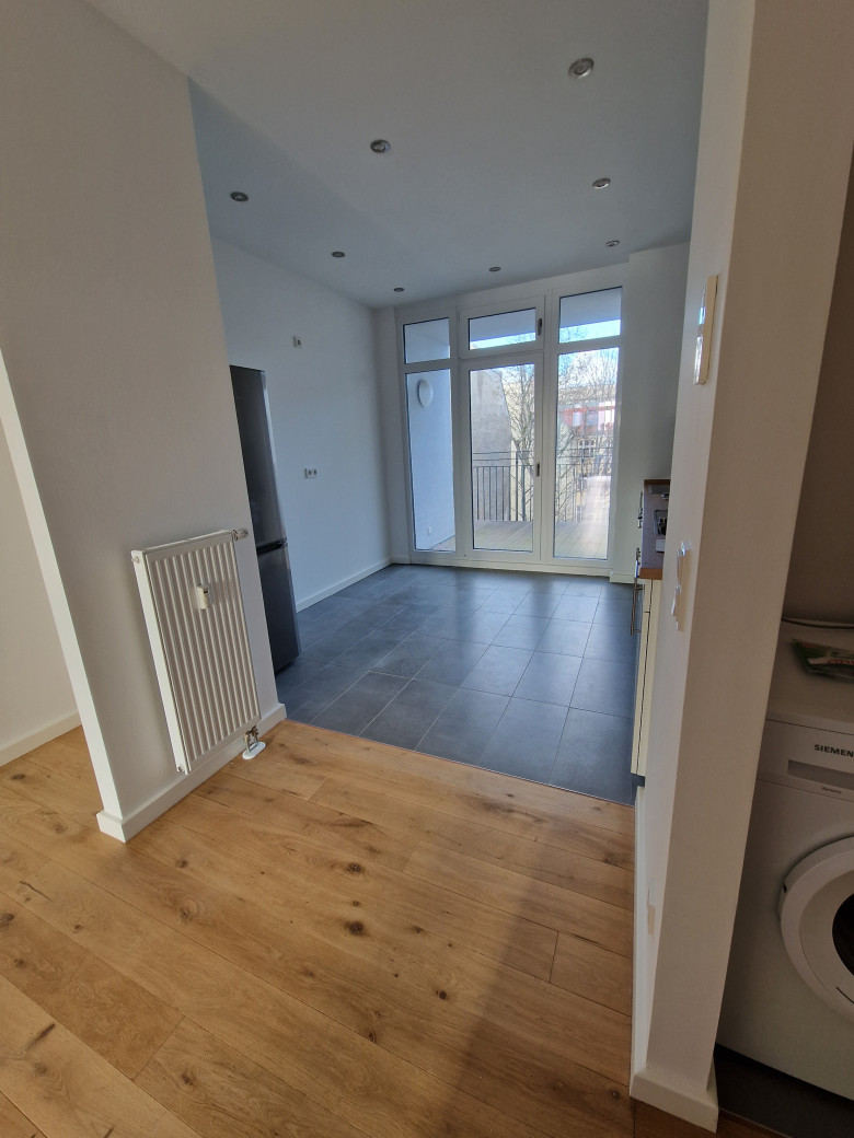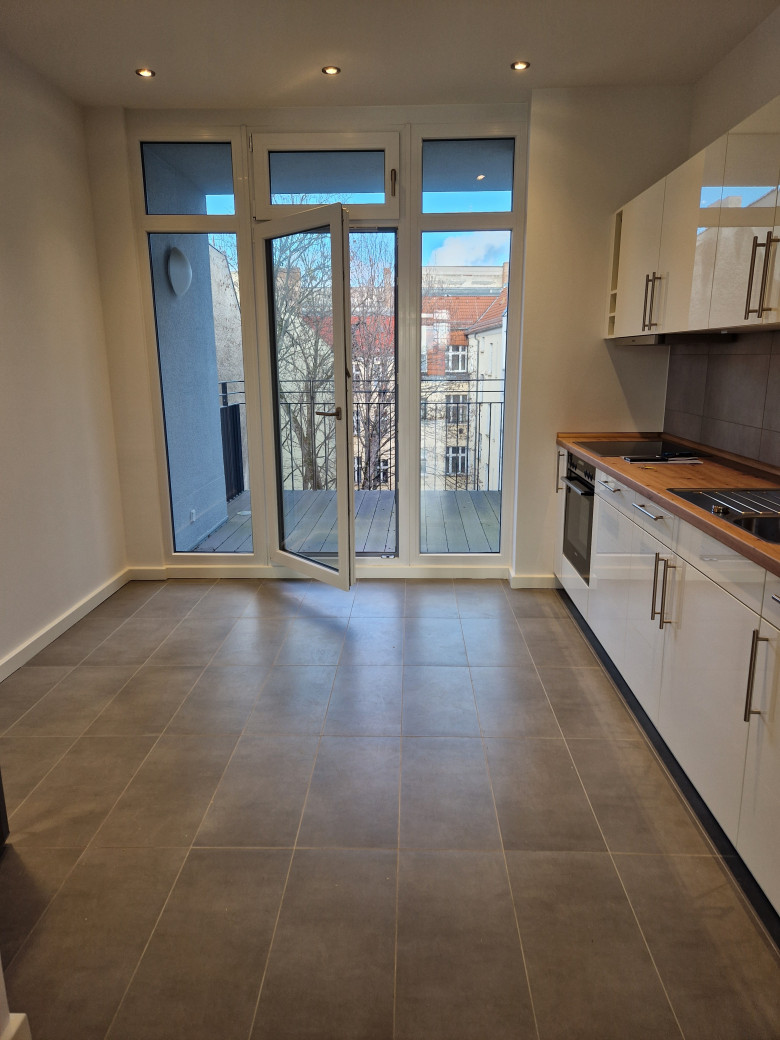 Die vollausgestattete Küche hat einen Fliesenfußboden und verfügt über moderne Geräte und es geht ein Balkon zum Innenhof ab.