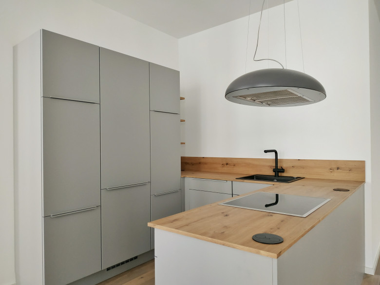 The property is located in a very modern and aesthetic residential complex. The rooms are equipped with fine wooden parquet and very large windows that let in plenty of light. The apartment has a spacious living room, connected to the new fitted kitchen with an oven, stove, kitchen cupboard and a large work surface. There are a bathroom and a guest WC with high-quality sanitary equipment and two balconies in a quiet location.