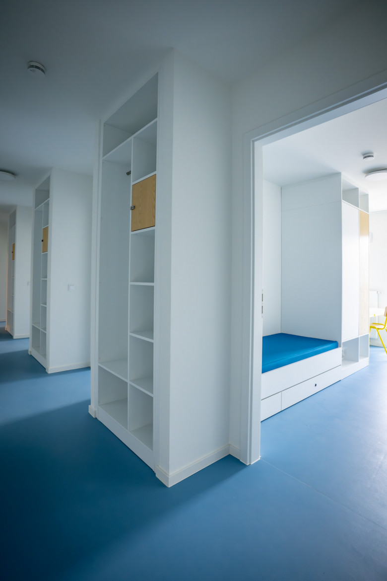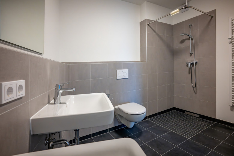 There are five rooms per flat, see floorplan attached . 4 single rooms and one double room. The single rooms are around 11m², the double rooms about 20m². Each flat has two bathrooms and one kitchen to share. All rooms are furnished and the kitchen is equipped with a basic inventory.