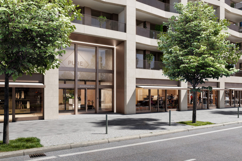 Der hohe Anspruch der Architektur ist sofort ersichtlich: ...an Wellen erinnernde Linien bringen Bewegung in die Fassade. Naturstein, bodentiefe Fenster und wohnliche Balkone mit bronzefarbenen Geländern prägen das elegante Erscheinungsbild von PURE.