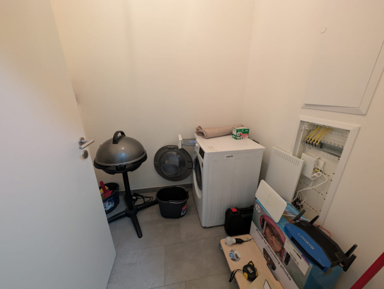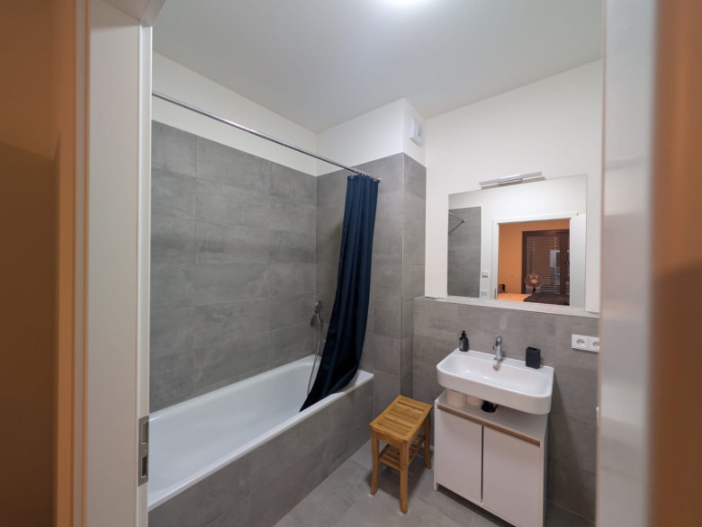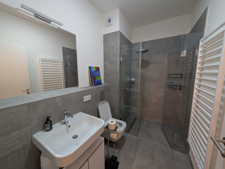 high-quality sanitary equipment, a walk-in rain shower and bathtub. The apartment contains a